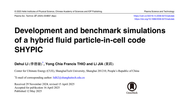 2025年5月12日,上海科技大学终极能源中心李德徽博士等在SCI期刊《等离子体科学和技术》(Plasma Science and Technology,PST)上发表题为“Development and benchmark simulations of a hybrid fluid particle-in-cell code SHYPIC”,报道了自主知识产权的动理学-流体混合等离子体模拟代码 SHYPIC 的开发应用进展。
