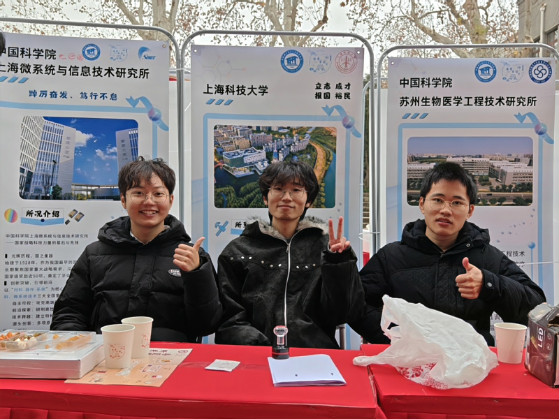 终极能源中心硕士研究生一年级同学在中国科学技术大学代培课程,活动筹备阶段,同学们积极参与,亲手设计宣传海报,并精心准备了上海传统美食“上海熏鱼”,向中科大师生表达诚挚问候。活动正式开始时,在“所系结合”主会场,同学们通过主题展板与现场讲解相结合的方式,全面展示了中心的研究特色、平台建设与人才培养成果。现场师生热情高涨,展台前陆续排起长队,交流气氛热烈融洽。